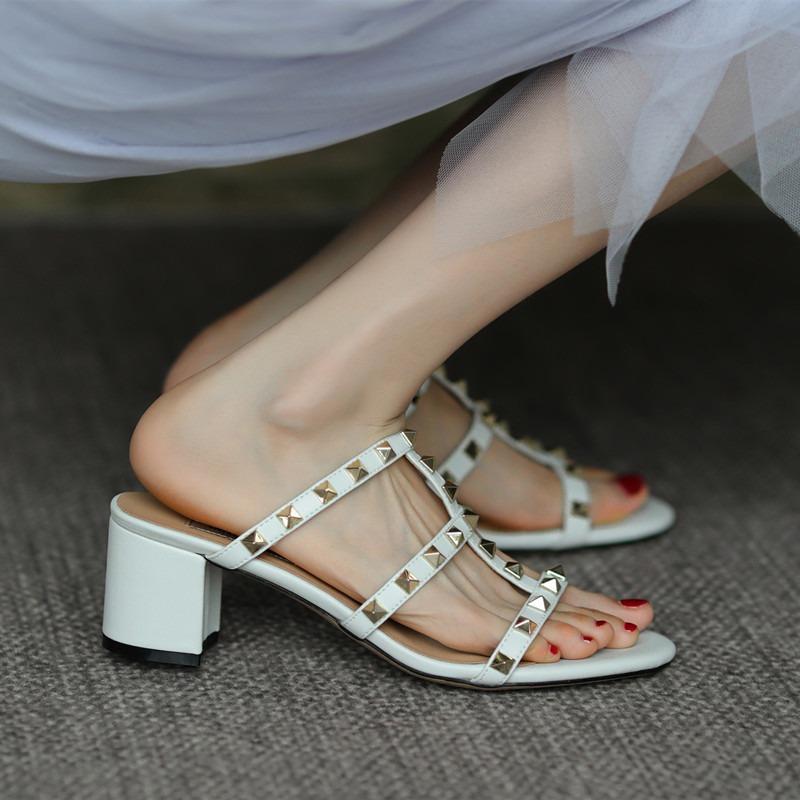 New Rivet Thick Heel Slippers Wear New Versatile Leather Sheepskin Word with Open Toe Medium Heel Cool Slippers Women