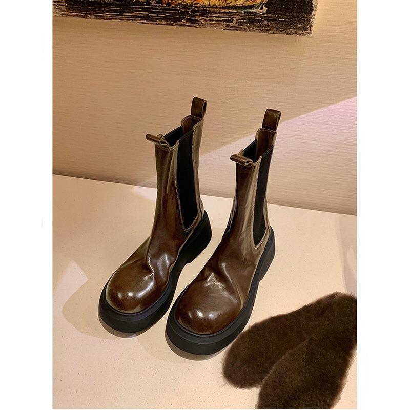 Cowhide Version~ Thick-soled Chelsea Short Boots Women's Round Head Elastic Band Thick Heel Medium Tube Martin Boots