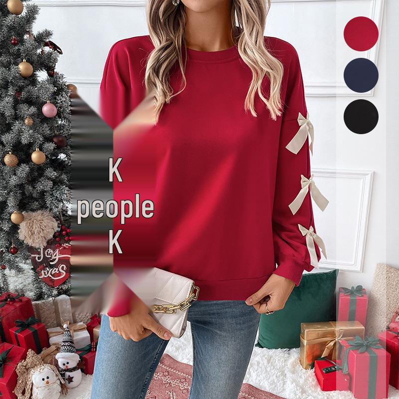 This cozy sweatshirt is perfect for the festive season, featuring a charming bowknot decoration that adds a sweet touch to any outfit. Made from a blend of polyester for durability and influencer cotton for a soft, comfortable feel, it is ideal for autumn and winter wear. The loose fit and round neckline ensure comfort and style, while the solid red color makes it a standout piece for any holiday gathering. With long sleeves, this sweatshirt is both stylish and practical for keeping warm during colder days.