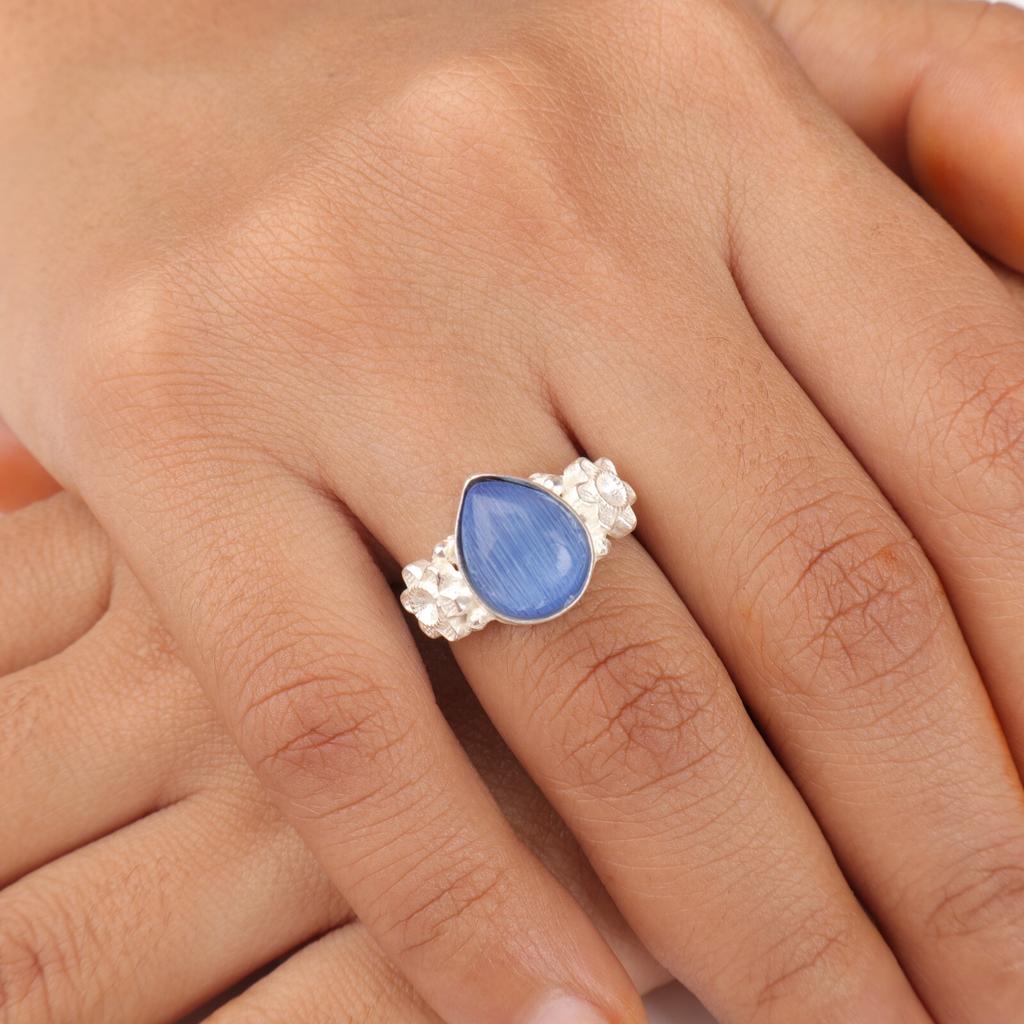 Dark Blue Cat's Eye Gemstone 925 Stamped Silver Jewelry Handmade Pear Shape Ring RR-59-40