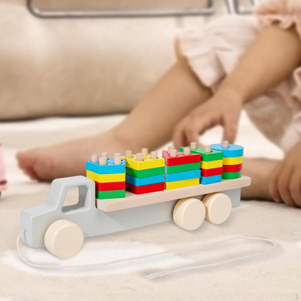 Wooden Building Blocks Vehicle Toy Preschool Shape Sorter Stacking Game Kids