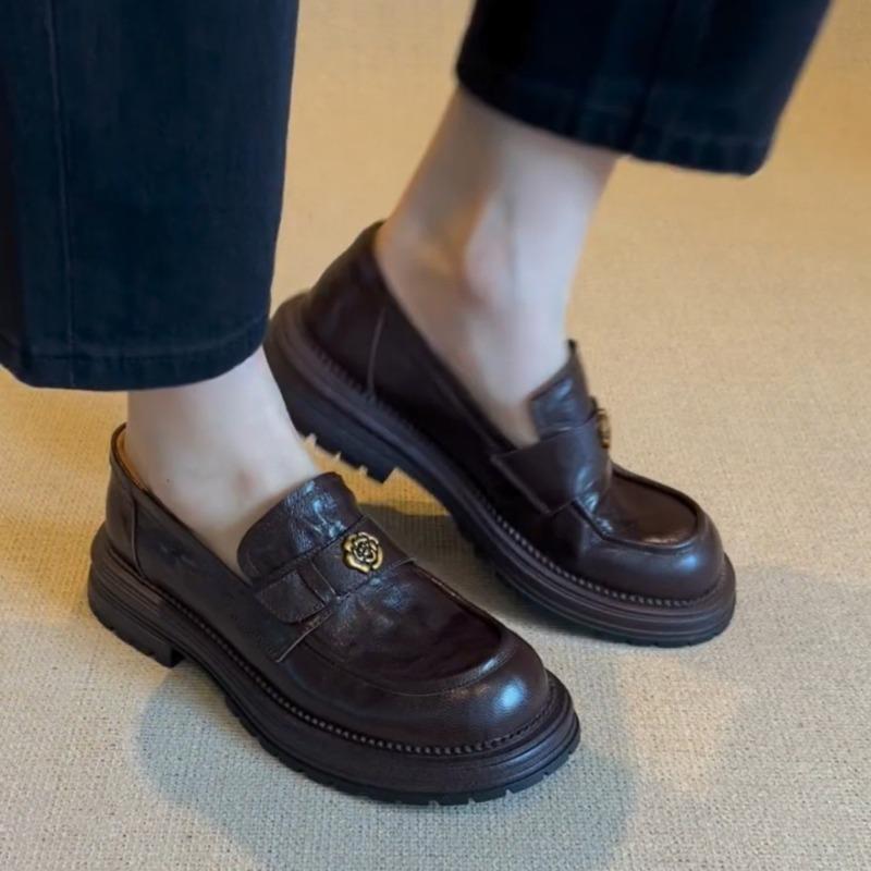 Sheepskin Version~ Genuine Leather Thick-soled Retro One-pedal Women's Camellia Black Small Leather Shoes Single Shoes