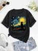 Women's Van Gogh Starry Night Cat Art Print T-Shirt - Black Short Sleeve Crew Neck Casual Top Cat Tshirt Summer Fashion