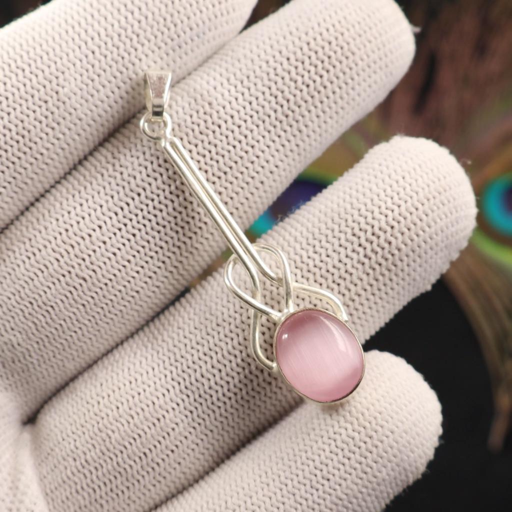 Pink Cat's Eye Gemstone 925 Sterling Silver Jewelry Pendant 1.79" Gift For Mom PP-60-49