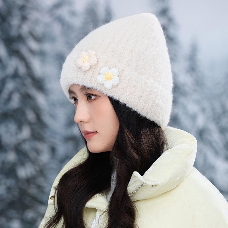 Autumn and Winter Hats for Women Thickened and Warm Flowers Knitted Wool Hat Korean Baotou Hat Outdoor Cold Protection Hat