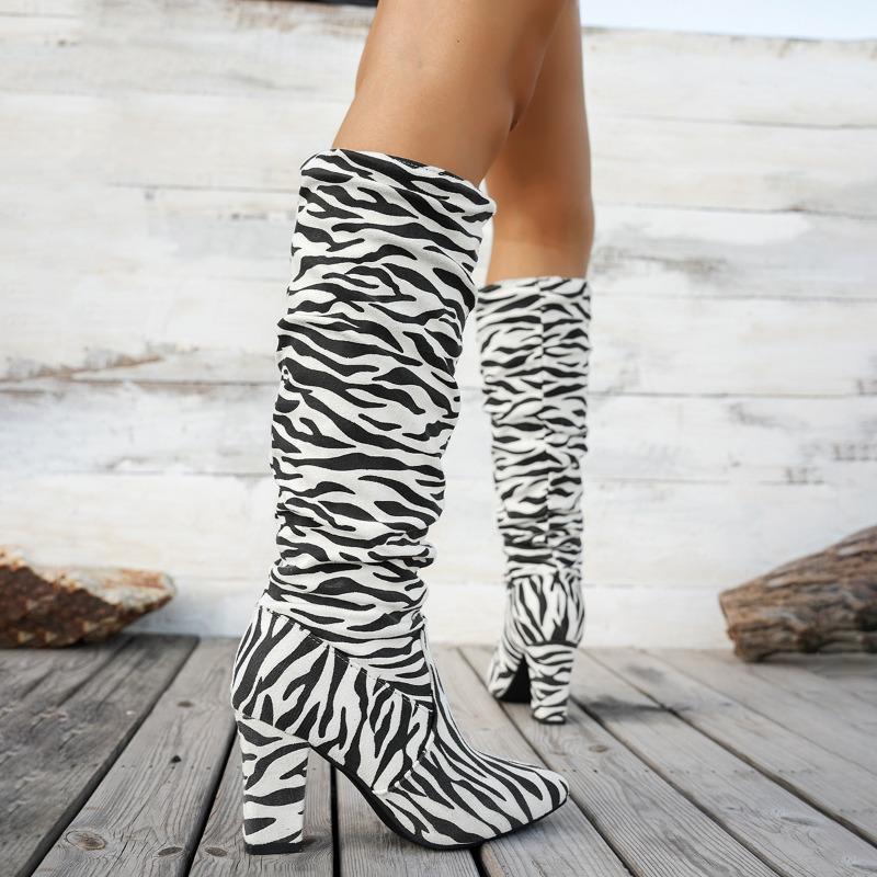 Wind New Pointed Zebra Pattern Thick Heel But Knee Boots Sleeve Large Size Super High Heel Trendy Women's Boots