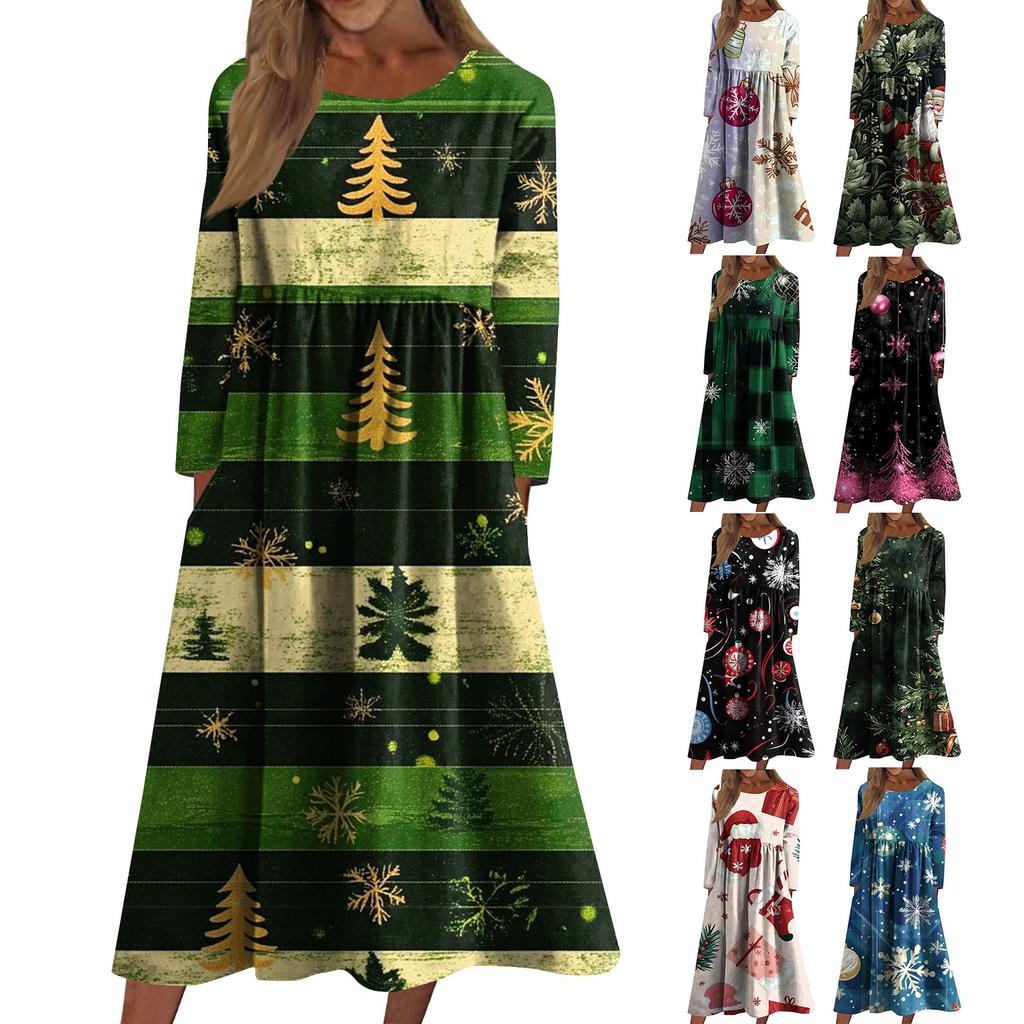 Women's Casual Crew-neck Christmas Print Mid-length Dress Long-sleeved Dress With Pocket