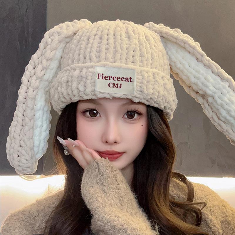 Korean Cute Long Rabbit Ears Thick Woolen Hat for Women In Autumn and Winter New Thickened Warm Ear Protection Pure Handmade Knit Hat