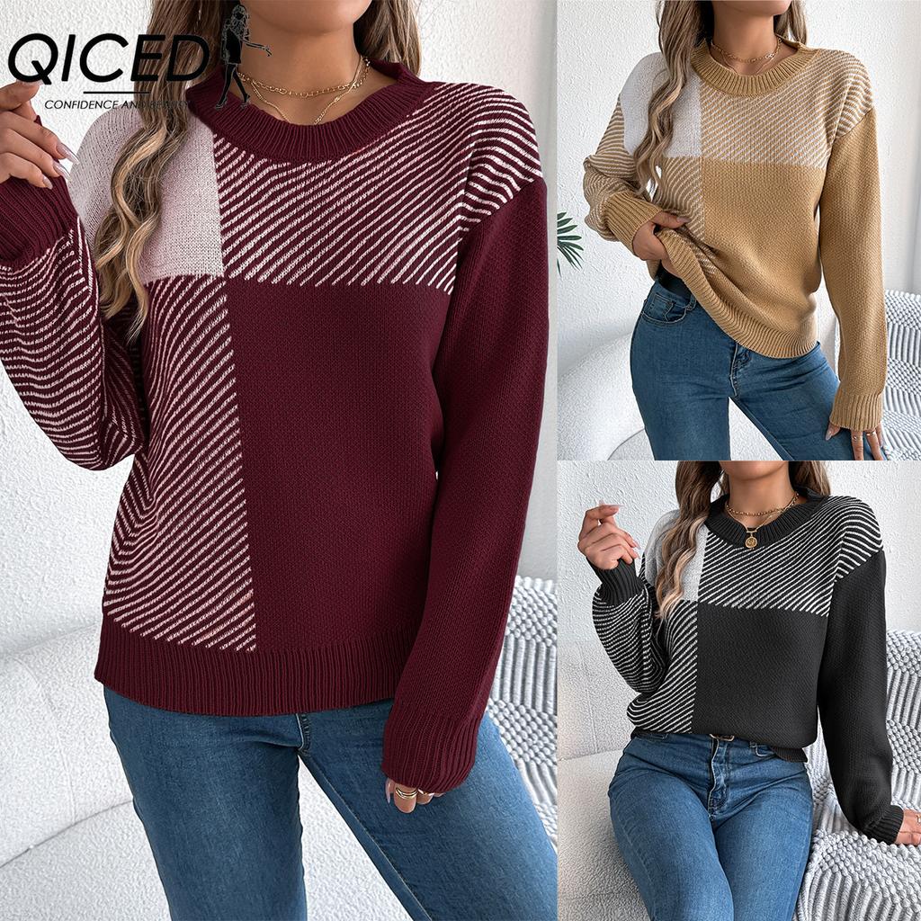 QICED Autumn and Winter Casual Checkered Long-sleeved Pullover Sweater for Women