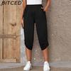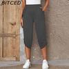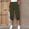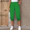 BITCED Women's Cropped Trousers with Pockets and Elastic Waist, Summer Buttons