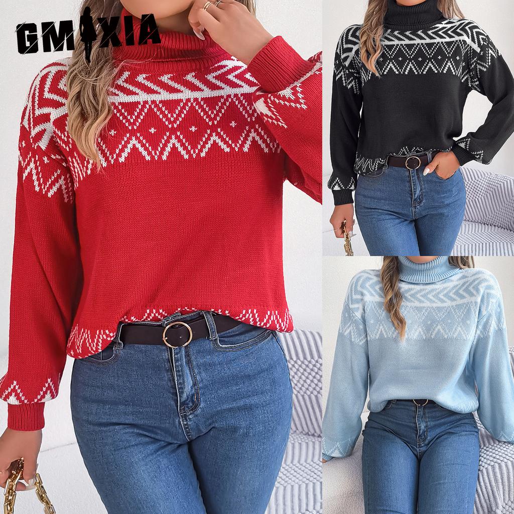 GMXIA Autumn and Winter Ethnic Style Retro Jacquard Lantern Sleeve Pullover High-neck Sweater Women's Clothing