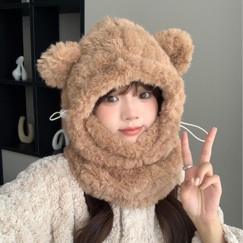 Plush Bear Knitted Ear Protection Hat Mask Scarf Integrated Warmth and Cold Protection Lei Feng Hat Women's Winter Thickened Plush