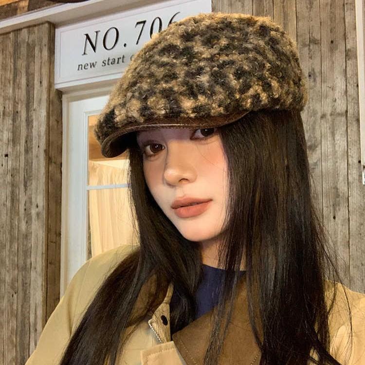 Velvet Leopard Print Forward Hat for Women In Autumn and Winter Versatile Personality Beret Windproof and Warm Baseball Cap