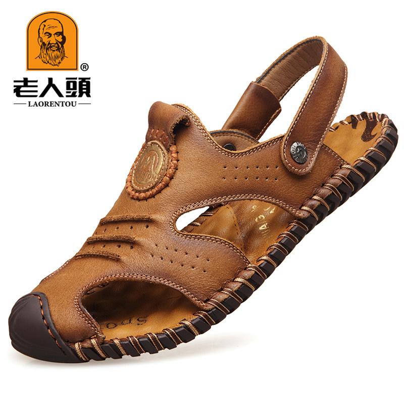 First Layer Cowhide Sandals Men's Old Man Head Sandals Summer Non-slip Soft Sole Dual-purpose Beach Shoes Men's Leather Sandals