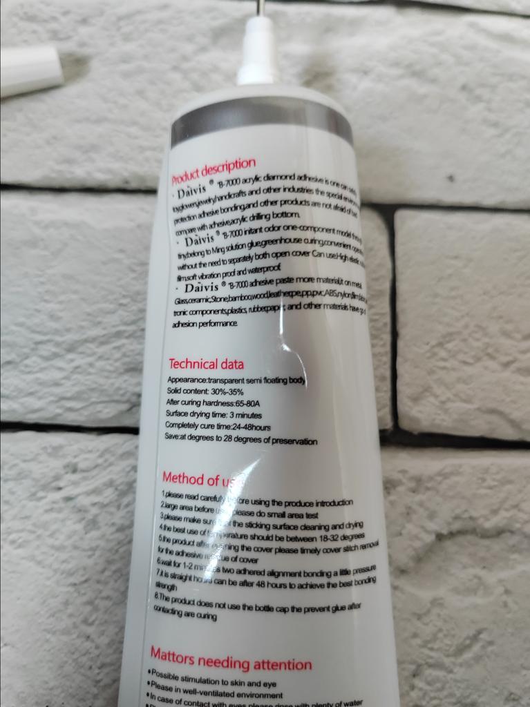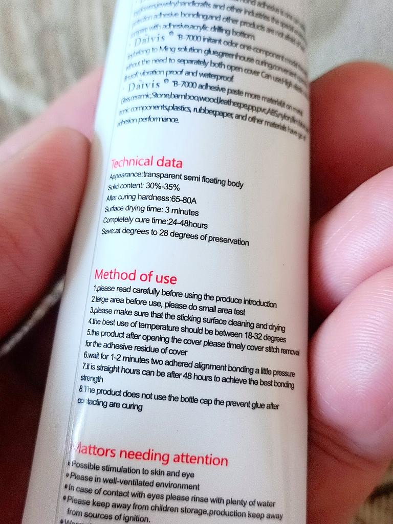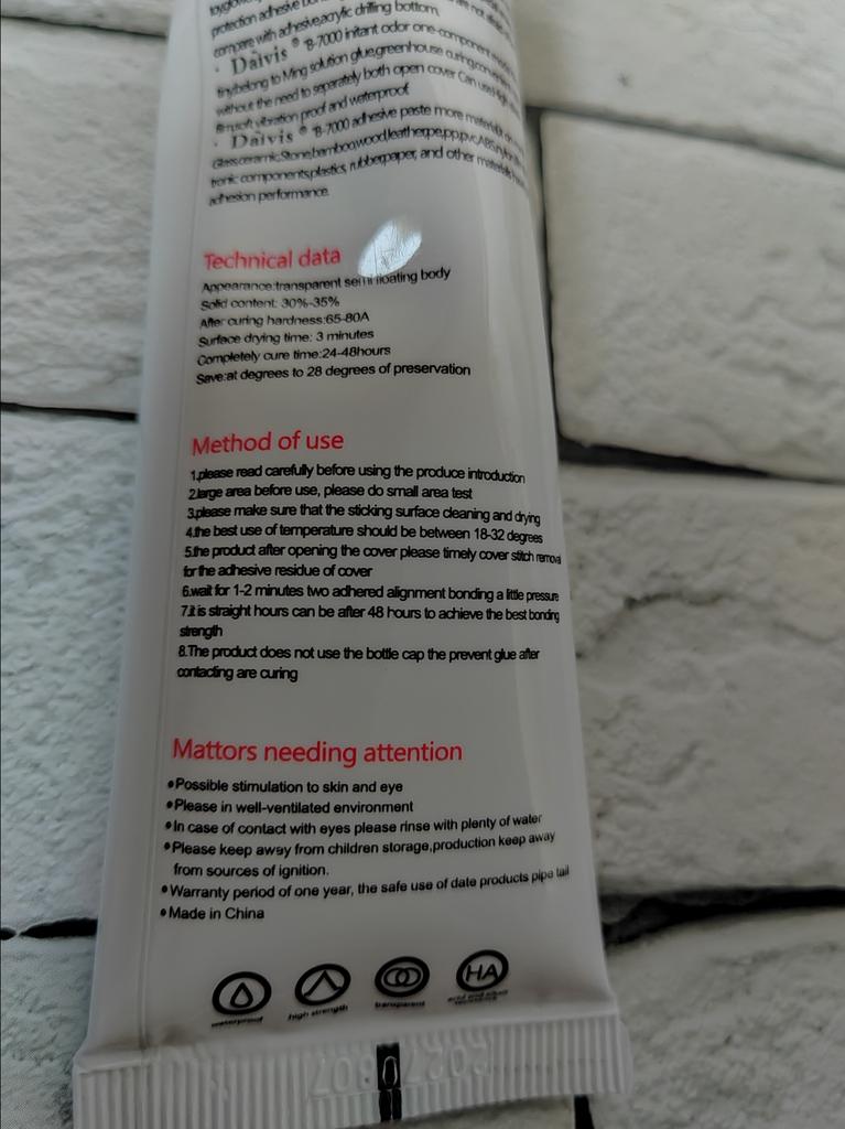 * High-performance adhesive * ⭐⭐⭐⭐⭐ 💥𝗟𝗶𝗲𝗳𝗲𝗿𝘇𝗲𝗶𝘁 About 3 weeks to Germany 💥𝗟𝗶𝗲𝗳𝗲𝗿𝘂𝗺𝗳𝗮𝗻𝗴 Included in the delivery are 1 super glue high-performance adhesive in different quantities (9,15, 25, 50 and 110 ml). I ordered the adhesive in the largest size (110 ml). The whole thing was packed in bubble wrap . 💥𝗤𝘂𝗮𝗹𝗶𝘁ä𝘁 The super glue is very economical! And very powerful! In the video you can see the consistency of the glue I would say gel-like. In any case, the adhesive can be applied super precisely thanks to the small applicator or applicator tip, and due to its viscosity, it gradually flows exactly into the corners where you need it.. After that, you have to hold the glue points together for about 6 minutes until the adhesive hardens. After about a minute, you can already notice how the parts to be repaired are sticking together. After about 48 hours, everything is completely cured. Thanks to the twist closure, the tip doesn't stick. The glue smells very strong and corrosive at the beginning, but this smell dissipates once everything has hardened.. I also think it's good that the glue is transparent. I am very enthusiastic about the good quality. 👌 The adhesive is truly an absolute all-rounder! You can repair and fix almost anything with it. ❌Disadvantage: I have not found any negative points. For material composition : The packaging is made of plastic. The application is in English, which I find advantageous. 💥𝗙𝗮𝘇𝗶𝘁 The adhesive is truly an absolute all-rounder! You can repair and fix almost anything with it 👌 Designed for use in arts and crafts and other industrial sectors. The Daivis B-7000 is a one-component, fast-smelling modeling adhesive (or instant bonding adhesive with odor development), which cures at room temperature and is ready for immediate use (no separate mixing required). It offers the highest strength, is vibration-resistant and waterproof. The Daivis B-7000 adhesive is suitable for a variety of materials. Components, plastics, rubber, paper, and many other materials exhibit excellent adhesive performance.. I can recommend this article without reservation ⭐⭐⭐⭐⭐ If you liked my review and it helped with a purchase decision, I would be happy if you followed me here, because many more useful reviews will follow in the near future. 😉