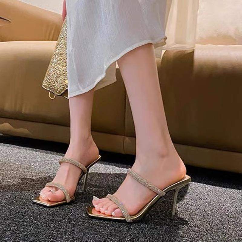 Fashion 2025 Open Toe Anti Slip Roman Sandals Summer New Rhinestone High Heels Sexy Stiletto Heels Square Toe Slippers Women