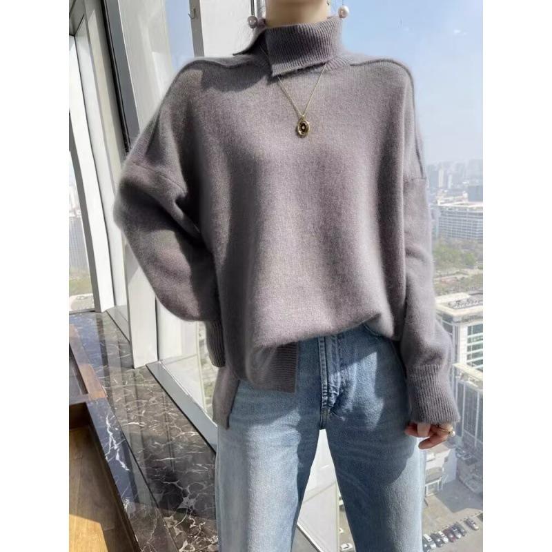 Autumn and Winter New High Lapel Collar Diagonal Split Fork Women's Versatile Loose Pullover Shoulder Sleeve Bottoming Knitted Sweater