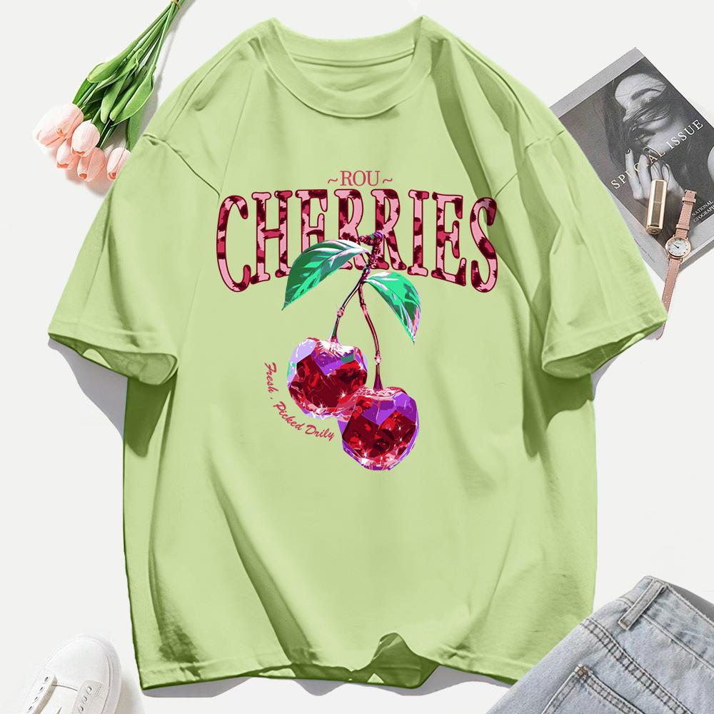 Crystal Cherries Printing Tee Shirt Woman Summer Cotton Tee Tops O-Neck Casual T Shirts Oversized All-Match Short Sleeve