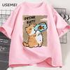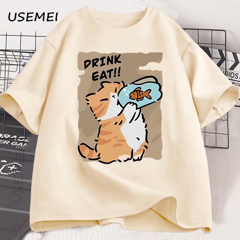 Funny Cat Eat Fish T-shirt Trend Printed Cotton Round Neck T-shirt Men and Women with The Same Loose Casual Short Sleeve Tees