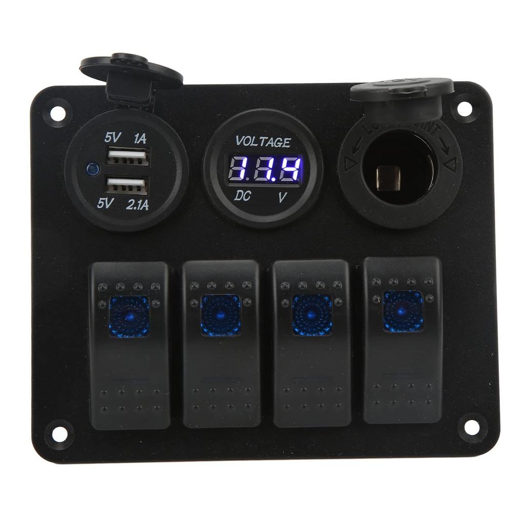 4 Gang Rocker Switch Panel: LED 4 gang switch panel with USB and cigarette lighter socket, USB and cigarette lighter charging socket and voltage monitoring display, perfect for all kinds of circuit control and charging needs. You control the car electronics by DIY. Universal application for -24V vehicles and is widely used in trucks, trailers, RVs, caravans, buses, seaboats, yachts and more