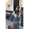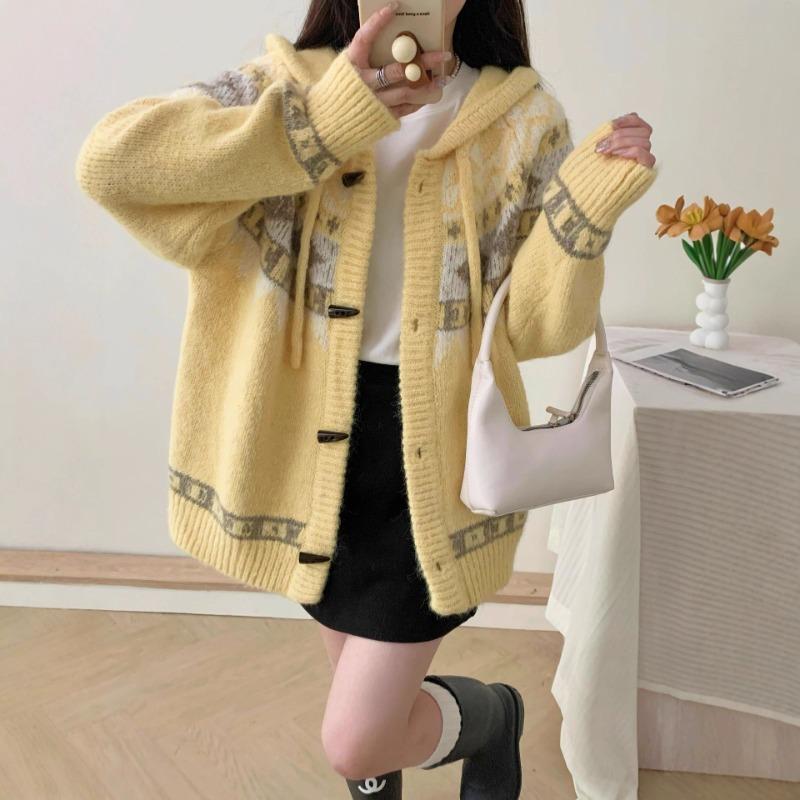 Vintage Fair Island Hooded Knitted Cardigan Women's Autumn and Winter New Versatile Loose Horn Button Sweater Jacket Women