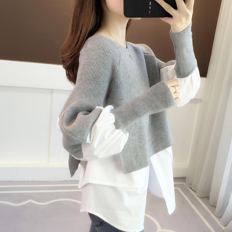 Knitted Sweater Fake Two Pieces Women's Autumn and Winter New Lazy Wind Splicing Sweater Loose Fashion Top