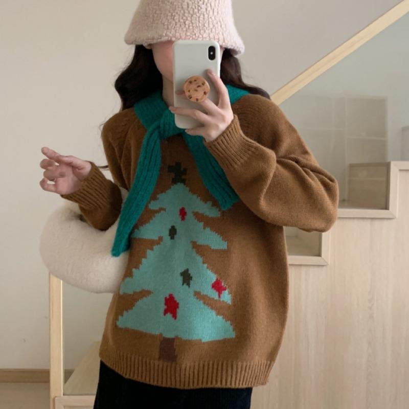 Crew Neck Red Christmas Tree Pullover Sweater Women's Autumn and Winter New Loose and Versatile Thickened Knitted Sweater Top