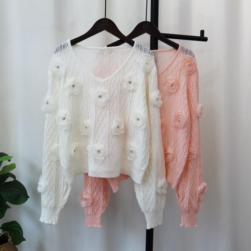 Heavy Industry Three-dimensional Flower Knitted Sweater Top Autumn New Thin Loose Sweet Gentle Sweater Pullover Woman
