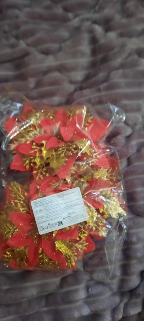 The glitter falls off. I opened the package, took out 1 flower and everything around was covered in this glitter - the floor, the table, and the clothes. And the hands … apparently some of them are allergenic (the glitter), I washed my hands, washed the clothes. Probably have to decorate the Christmas tree in gloves…