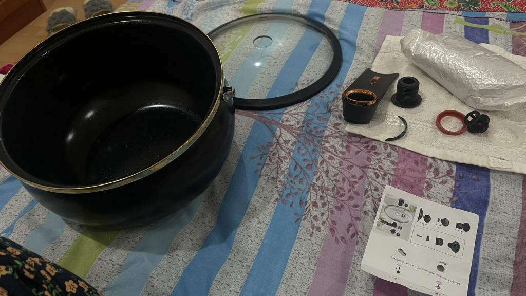 Steamer saucepan with ceramic coating ❤️ Created for a large family, because it holds 8 liters at once. I got used to boiling meat - very convenient. The saucepan has a valve in the lid through which all the steam escapes. The lid itself can be fixed with extendable parts in the handle, so it won't fall off and break.. Arrives in excellent packaging: an outer box, inside a layer of bubble wrap. The pot itself is also in a bag in disassembled form. The handles and lid are in individual bags, there are instructions for screwing them on. Everything is very simple and easy.