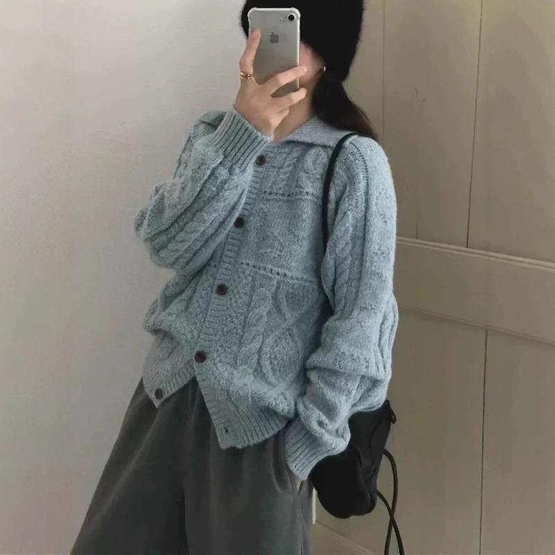 Retro Twist Lapel Knitted Cardigan Autumn and Winter New Loose Long-sleeved Sweater Jacket Women