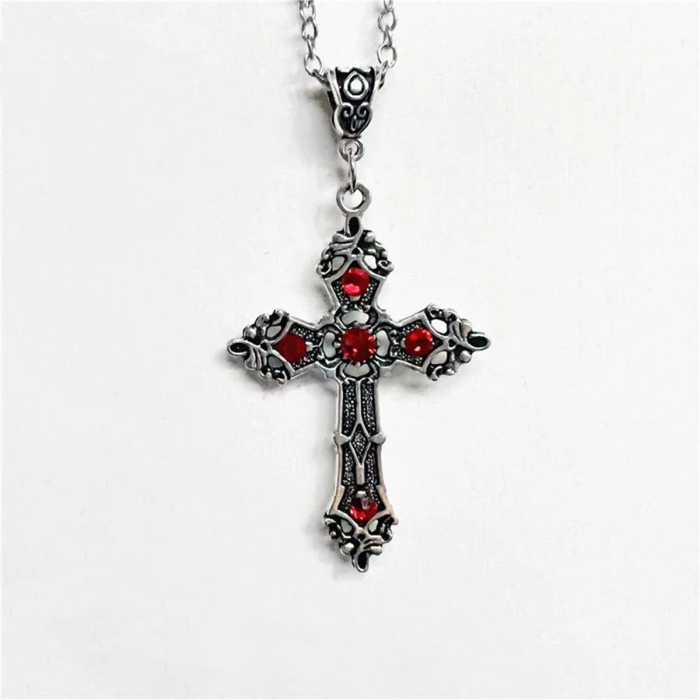 Simple Fashion Creative Trend Gothic Large Baroque Christian Cross Pendant Necklace Micro Inlaid Red Crystal PrayerAmuletZircon