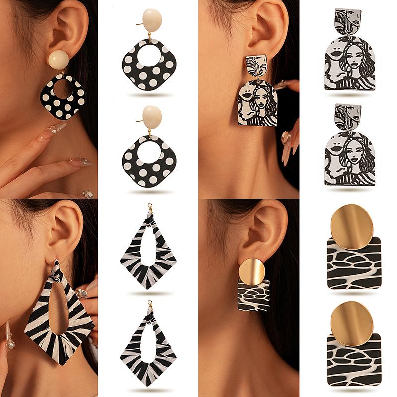 Black and White Polka Dot Striped Leather Earrings for Women Personality Exaggerated Drop Earrings Simple High-end Zircon Gift