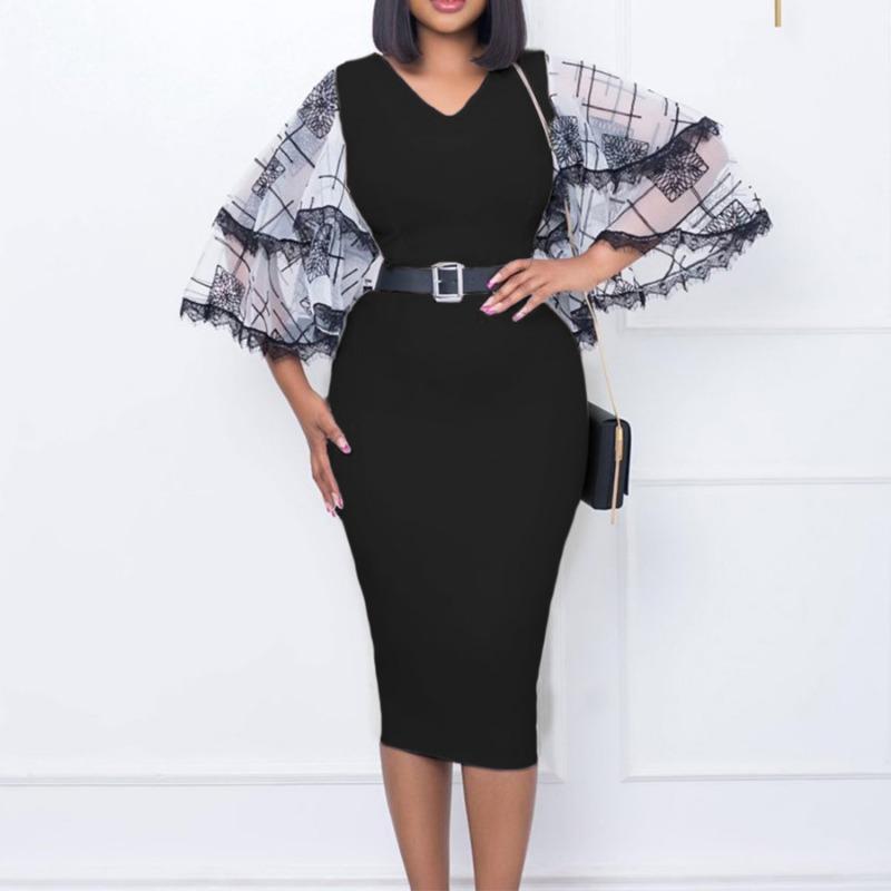 Women's New V-neck Horn Sleeve Hip Wrap Commuter Office Pencil Skirt Dress