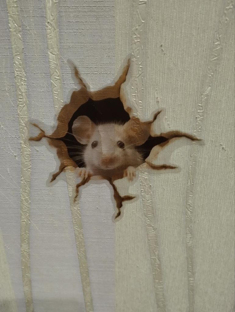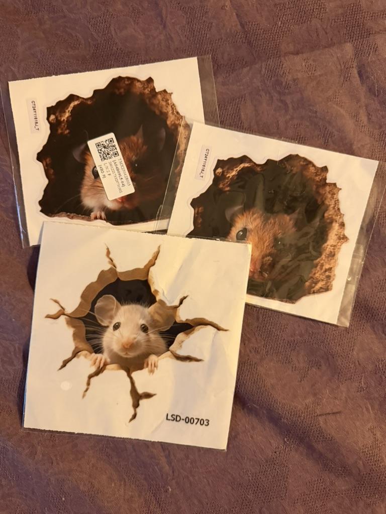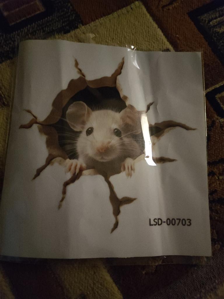 Cool sticker, fit well, covered the hole in the wallpaper. At night the cat caught this mouse, tore off the sticker, it looks so realistic. Had to stick it on thoroughly, with glue.
