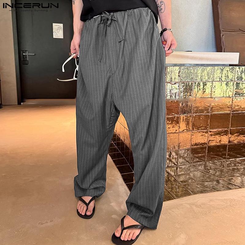 INCERUN Men Drawstring Belt Waist Striped Casual Drop-crotch Pants Long Trousers
