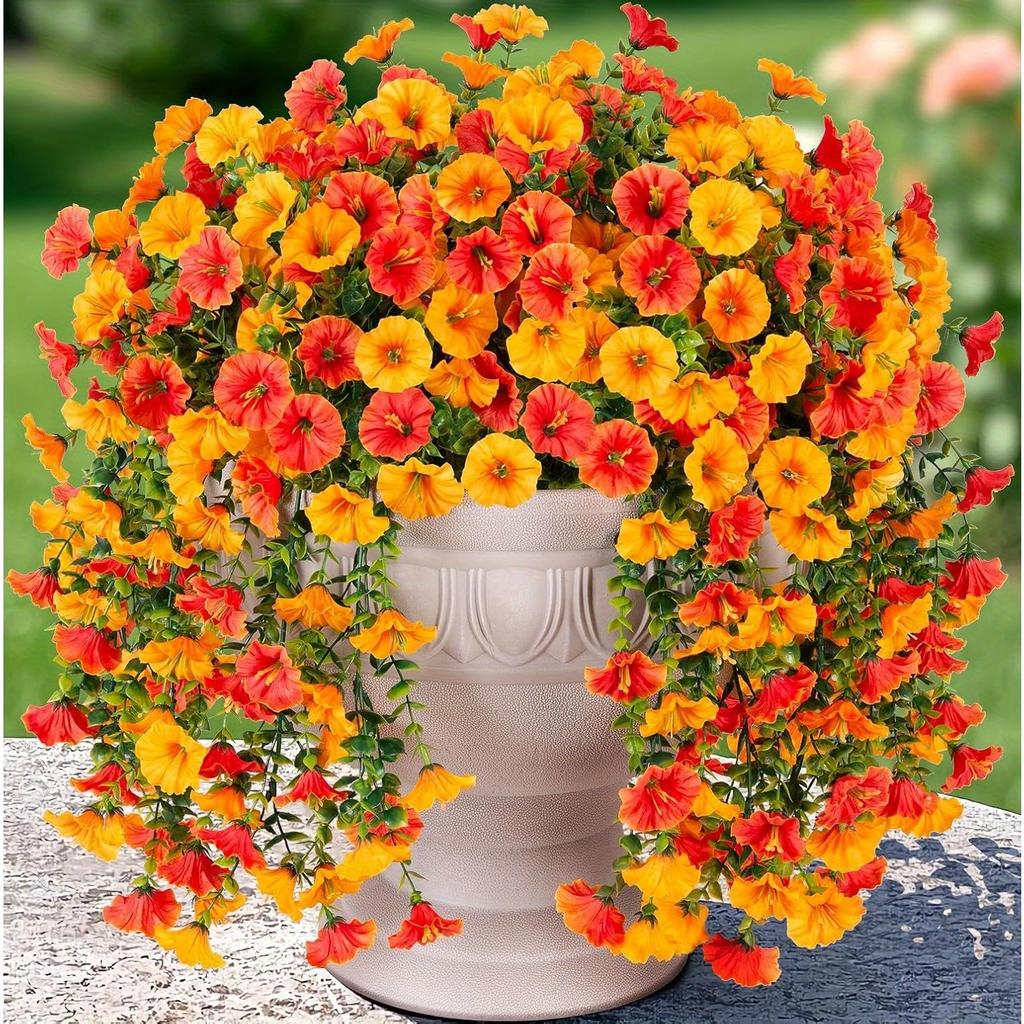 2pcs Artificial Hanging Petunia & Eucalyptus Flowers - Weatherproof Vibrant Orange Blooms with Green Leaves, Garden Decorations, Patio Decoration