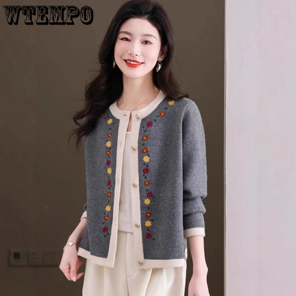 Patchwork Embroidered Knitted Cardigan for Women Solid Color Casual Sweater Coat Autumn and Winter Round-neck Top
