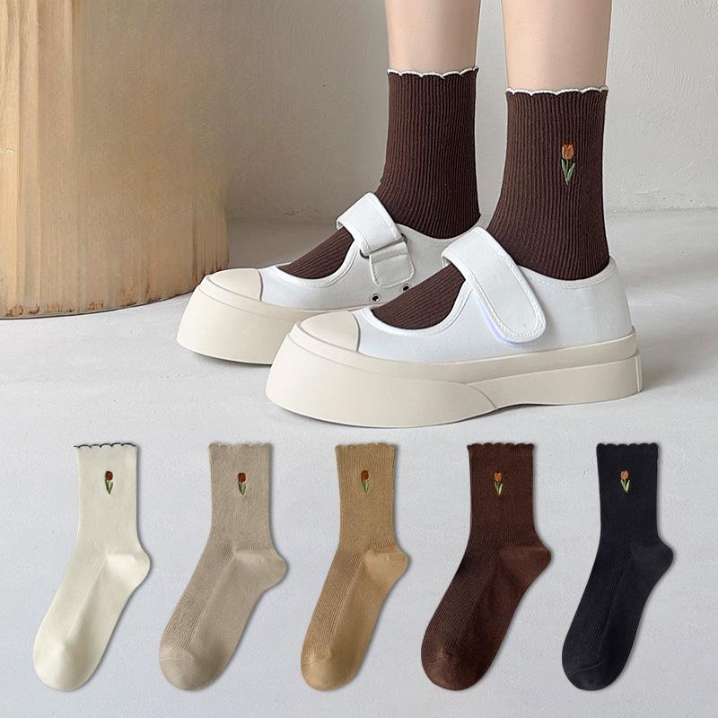 Women's Spring and Summer Tulip Flower Embroidered Mid Calf Cotton Socks