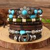 Boho Bracelet Set for Men Leather Braided Wrap Bracelet with Wood Beads Bull Skull & Evil Eye Charm Ethnic Viking Style Jewelry