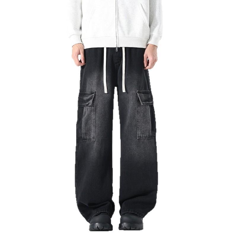 Autumn New Three-dimensional Pocket Work Pants Men's Grey Wash Straight Jeans