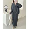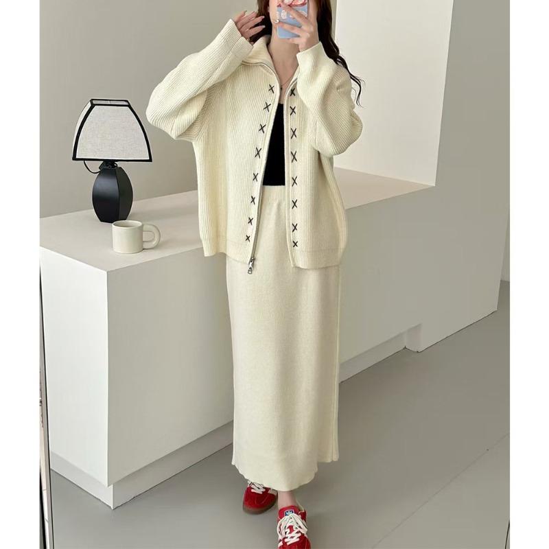 Double Zipper Lapel Sweater Women's Suit Autumn and Winter New Lazy Medium and Long Skirt Knitted Cardigan Two-piece Set