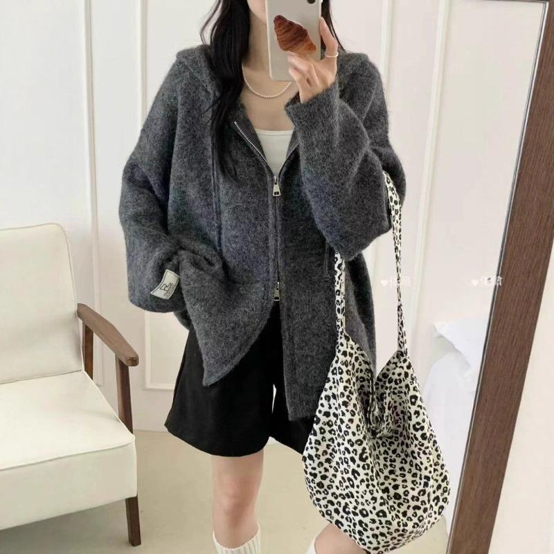 Autumn and Winter New Casual Versatile Hooded Zipper Knitted Cardigan Women's Loose Lazy Wind Thin Sweater Jacket