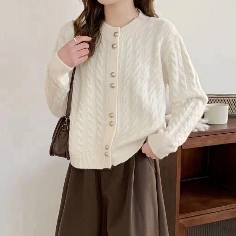 Autumn and Winter New Retro Twist Double Button Knitted Cardigan Women's Crew Neck Versatile Loose Sweater Jacket Tide