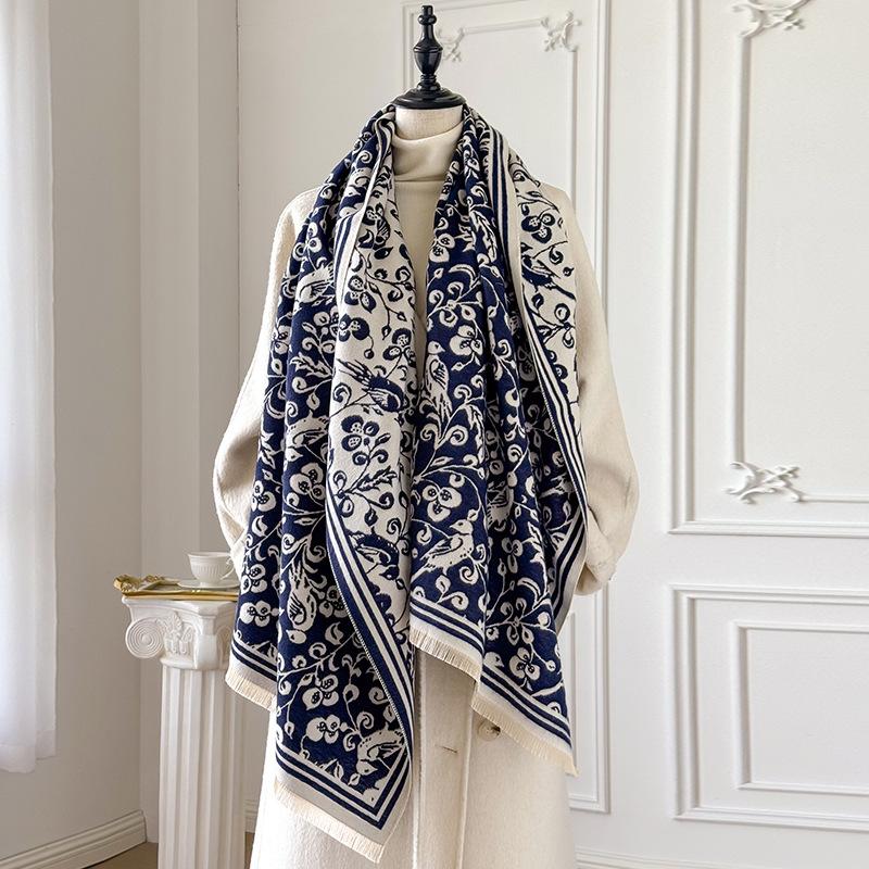 Autumn And Winter Flower Imitation Cashmere Scarf Thickened Printed Shawl Versatile Cold And Warm Long Dual-Purpose Scarf