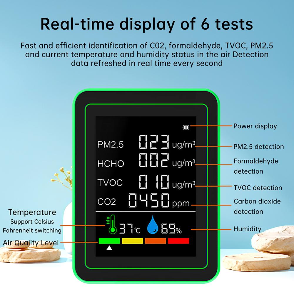 6 In 1 Air Quality Monitor Portable Rechargeable CO2 HCHO PM2.5 TVOC Household Air Detector 2.8-inch Color Screen Display