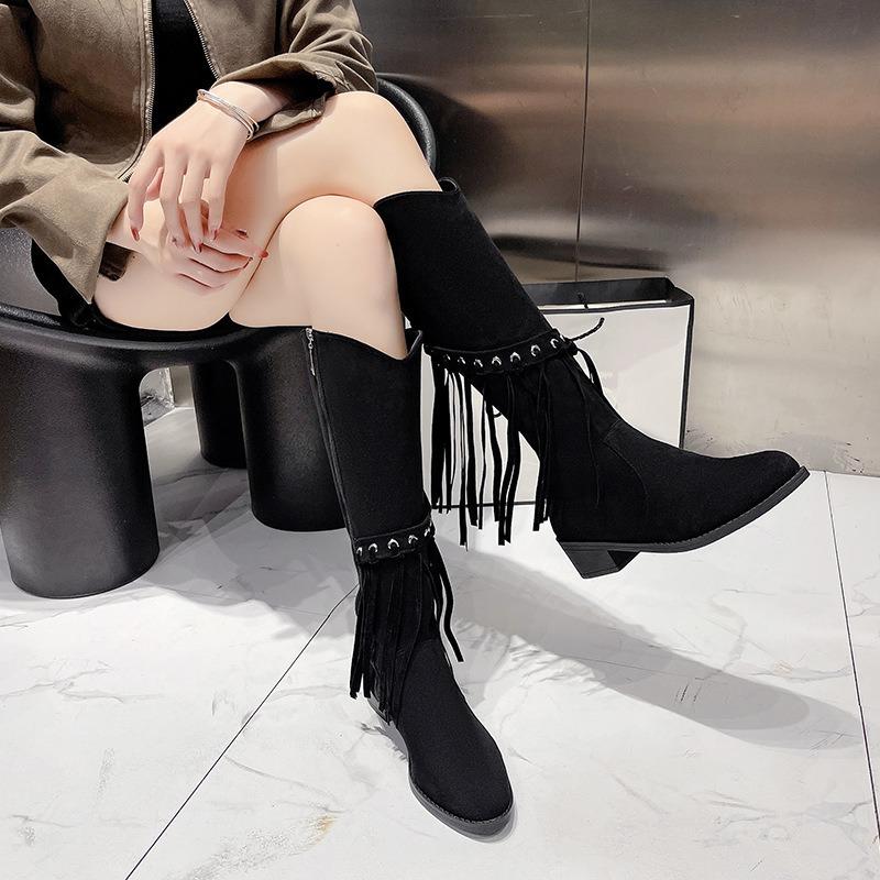 Large Size Fringed Boots Women's Autumn and Winter New Retro Suede Thick Heel Side Zipper Long Fashion Boots