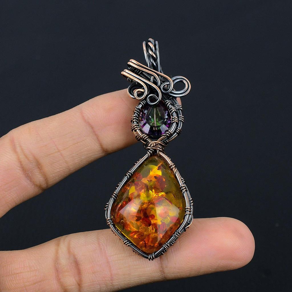 Baltic Amber & Mystic Topaz Pendant, 999 Copper Wire Wrapped Gemstone Jewelry, Handmade Pendant For Mother Day