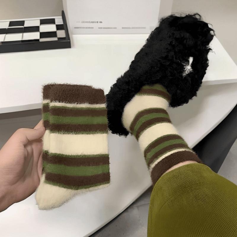 Autumn and Winter Warm Plush Socks, Mink Fleece Retro Color-blocked Striped Thickened Fleece Postpartum Socks for Girls