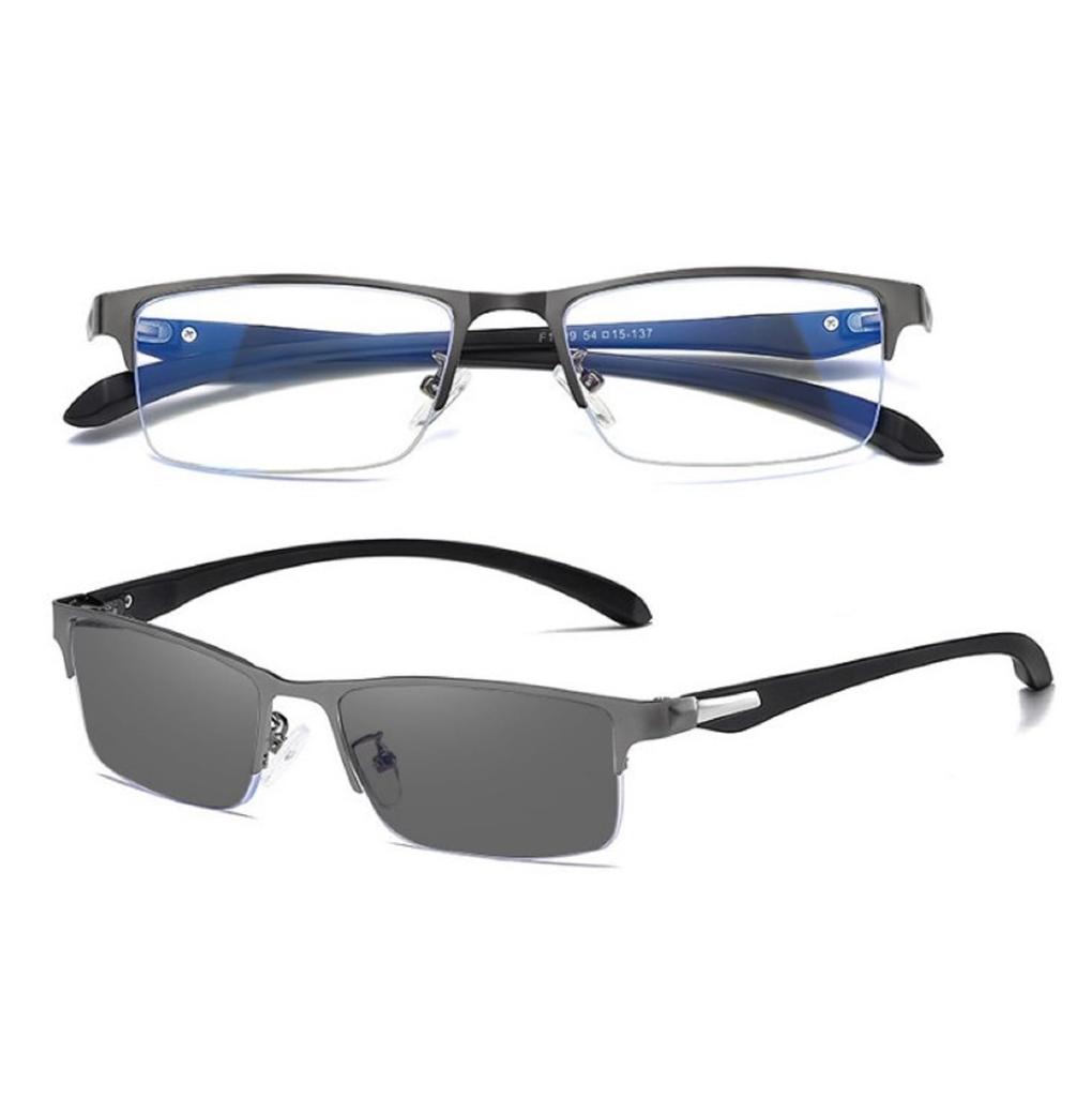 [2-Way Use for Business/Outdoor Use] These glasses feature two-way lenses that block blue light, essential for computer work, and a photochromic function that changes color in sunlight when outdoors. [Blue Light Blocking Rate: 40% (JIS Standard)] The 40% blue light blocking lenses are ideal for desk workers and those who spend long hours at work using a computer, as well as those who play e-sports, game, or use their smartphones. (A higher number does not necessarily mean better quality.) [Frame Design Features] The half-rim frame (nylon) creates a business-like look with grooves around the edge of the lens and a transparent nylon thread that secures the lens in place, ensuring a wide field of view. [Photochromic and Color-Changing Function] Indoors, the clear lenses appear almost transparent at approximately 5% light intensity (although they have a yellowish tint due to the blue light blocking treatment). When outdoors on sunny days, the color changes to approximately 30% light intensity. This is not a dark color that makes it impossible to see (about 60%), but a light gray discoloration, a soft color sunglasses type discoloration that is currently trending and often seen worn by celebrities.